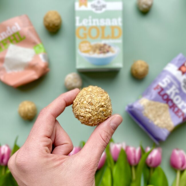 - Aus je einem Esslöffel Bällchen formen und optional in Leinsamen, Mandelmehl oder Kokosraspeln wälzen.