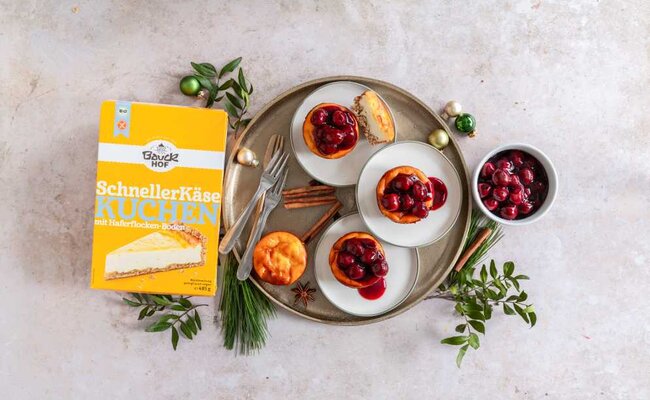 Genug von Gänsebraten oder Würstchen mit Kartoffelsalat? Ihr wollt euren Gästen an Weihnachten mal etwas anderes bieten? Dann haben wir genau die richtige Inspiration für euch: Beim Drei-Gänge-Menü mit Bauckhof-Produkten ist für alle was dabei. Gebackener Rotkohl mit Hafer Crunchy, Kastanien-Gnocchi und Mini-Käsekuchen mit Punschkirschen sorgen für die richtige Feiertagsstimmung und gefüllte Bäuche.