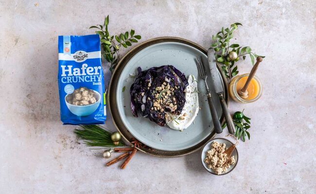 Rotkohl muss nicht immer als Beilage serviert werden. In gebackener Form macht er sich auch als Vorspeise fantastisch. Gebacken? Ja, mit einer Marinade aus gehackter Schalotte und feinen Gewürzen kommt der Rotkohl zunächst in den Ofen. Der gebackene Kohl wird mit einer würzigen Creme aus Frischkäse, Schmand, Salz, Pfeffer und etwas Chili serviert. Doch damit nicht genug: Abgerundet wird die Vorspeise vom Bauckhof Hafer Crunchy, der als Topping genau die richtige Dosis Knusprigkeit dazugibt.