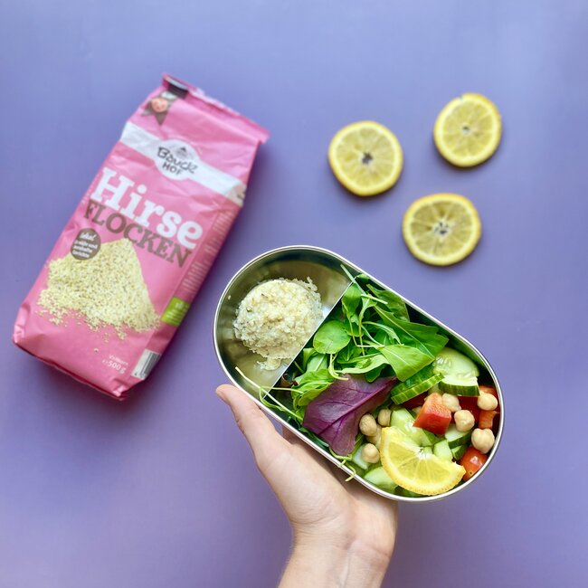 - 100 g Bio Vollkorn Hirseflocken von Bauckhof + 200 g Gemüsebrühe
