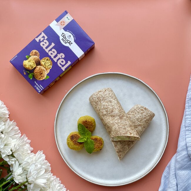 Zubereitung: Falafel nach Packungsanleitung zubereiten, alle Zutaten in den Wrap geben, zusammenrollen und genießen.