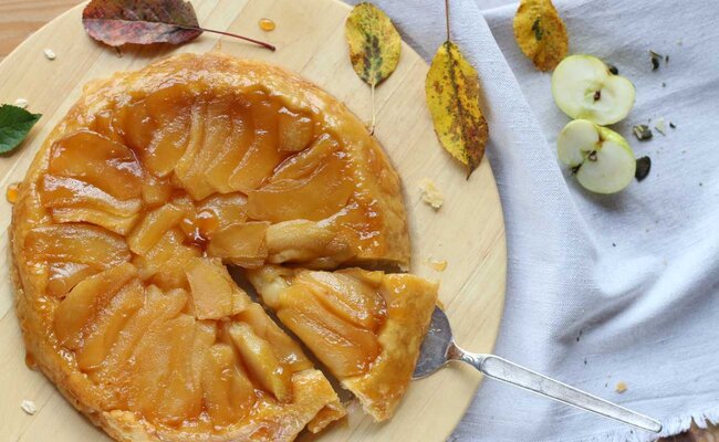 - Die Tarte wird nach dem Backen auf einen Teller gestürzt. Hierbei bitte aufpassen, da man sich an der heißen Pfanne verbrennen kann.