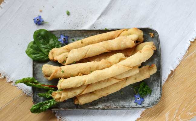 Hier ersetzen wir den weizenhaltigen Filotteig durch dünn ausgerollten glutenfreien Flammkuchenteig.