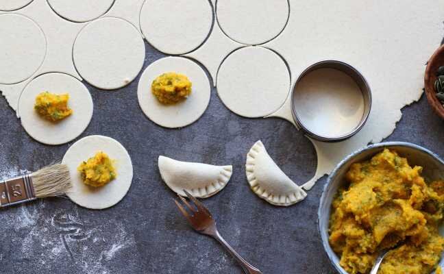 - Mit einem runden Ausstecher (Durchmesser 7 cm) Ravioli aus dem Teig stechen.