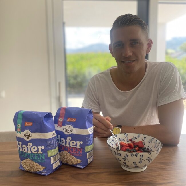 Ansonsten kriegen wir immer morgens einen Vitamin-C-Shake und Porridge. Ich frühstücke auch immer zu Hause mit Haferflocken, Banane, verschiedenen Nüssen und Kernen. Da gibt es so viele Variationen. Wir investieren viel Zeit in diese Dinge, aber es lohnt sich.
