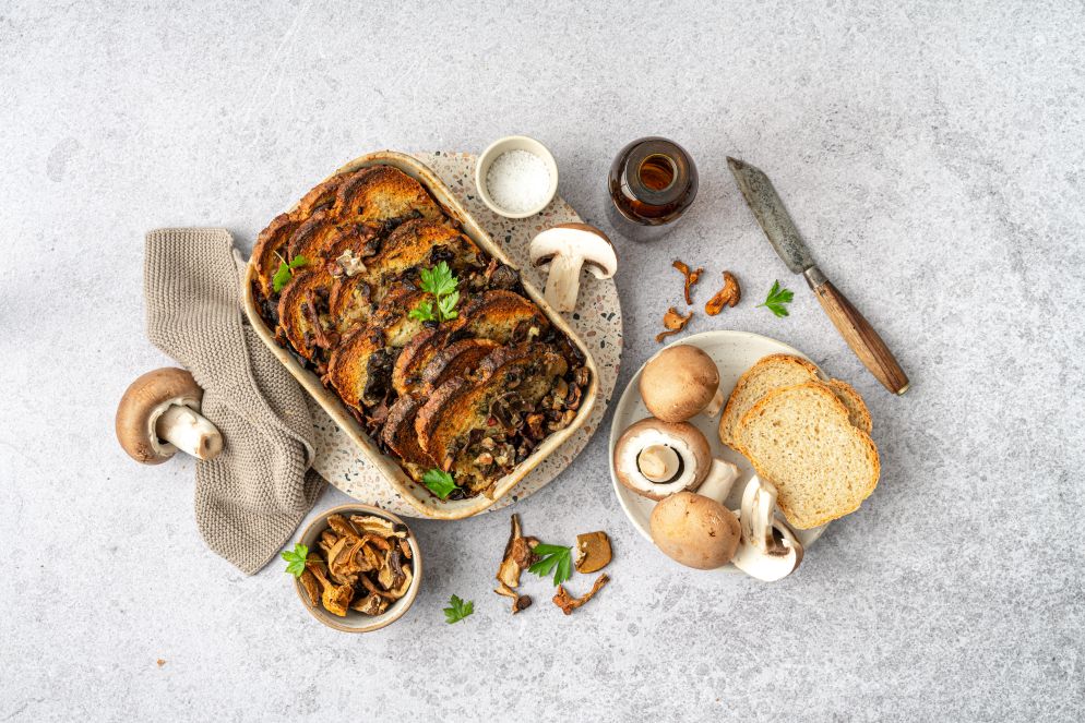 Die Brotscheiben in einer Auflaufform fächerartig anrichten und mit Milch tränken. Die Pilzmischung zwischen den Brotscheiben verteilen.