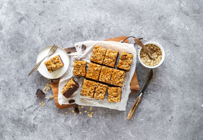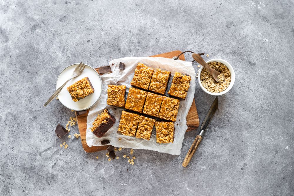 Das Ganze wieder zurück auf den Herd geben und so lange weiter erhitzen, bis alles wieder flüssig ist. Nun die Haferflakes unterrühren und die Masse auf den kalten Brownies verteilen.