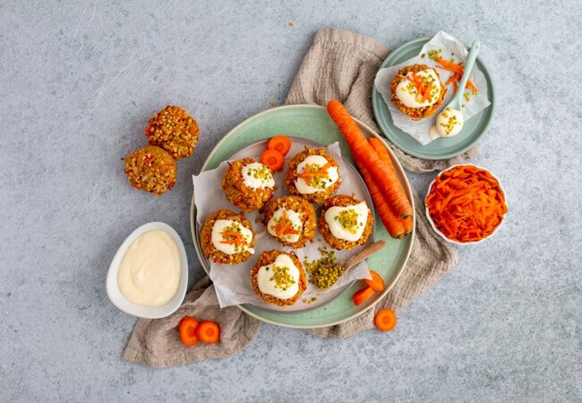 Die Papierförmchen in die Mulden eines Muffinblechs geben. Nun den Carrot-Cake-Crumble auf die Muffinförmchen verteilen und kompakt festdrücken.