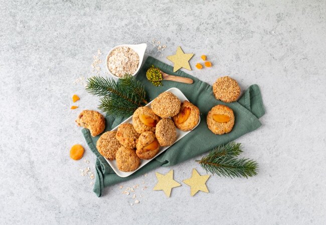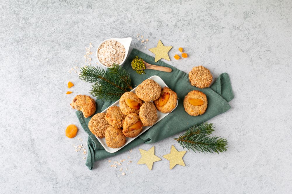 Je ca. 2 TL von dem Plätzchenteig mit den Händen erst zu Kugeln formen, dann etwas flach drücken und auf ein mit Backpapier ausgelegtes Blech setzen. Optional zuvor mit der Oberfläche in Sesam eindrücken oder alternativ mit einer halbierten getrockneten Aprikose garnieren.