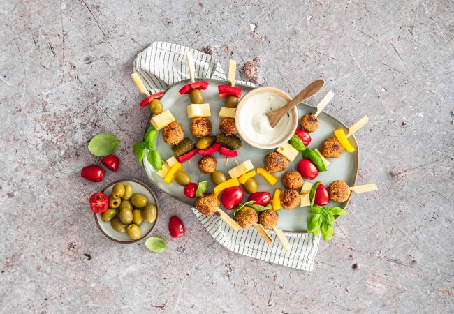 Das Gemüse schneiden. Burger-Bällchen und Gemüse abwechselnd aufspießen.