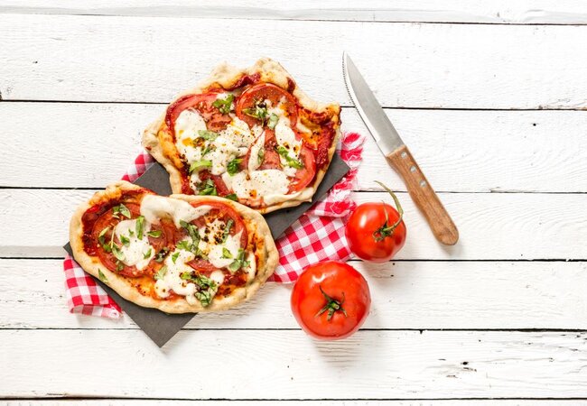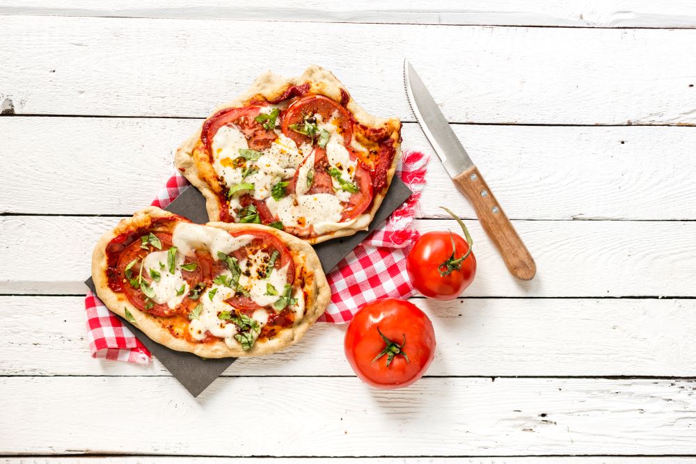 Den Pizzateig in 6-8 Portionen teilen – je nachdem wie groß der Grillrost ist. Den Teig auf einer bemehlten Fläche dünn ausrollen, mit etwas Tomatenmark bestreichen und diesen mit Tomaten und Mozzarella belegen. Das Ganze nicht zu dick, sonst bekommt der Teig zu viel Feuchtigkeit. Etwas mehr Mehl unter der Pizza hilft dabei, die Pizza später besser auf den Grill zu bekommen.