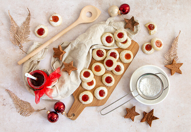 Die Engelsaugen mit dem restlichen Puderzucker (1 EL) bestäuben und servieren bzw. luftdicht verschlossen aufbewahren.