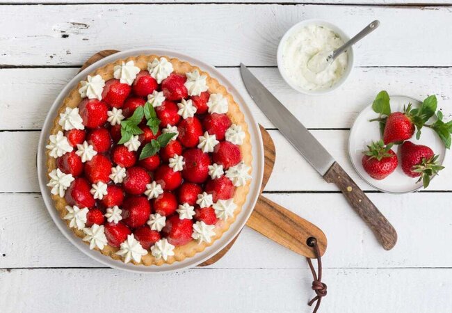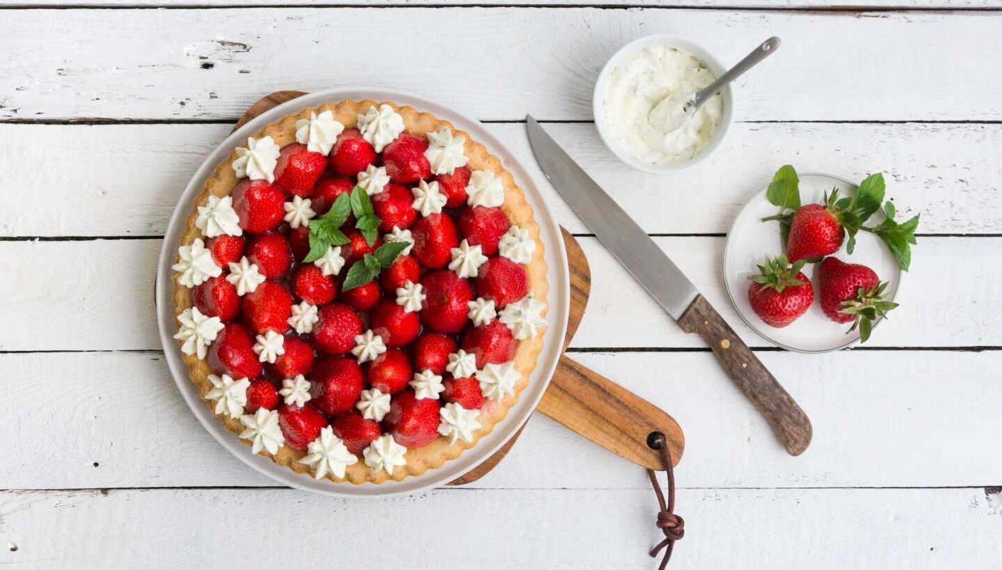 Den abgekühlten Boden mit Marmelade bestreichen und die Erdbeeren darauf verteilen.