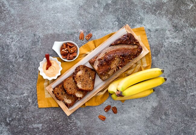 Den Teig in eine gefettete oder mit Backpapier ausgelegte Kastenform geben. Die übrige Banane 1x der Länge nach halbieren und auf den Teig legen. . Mit den restlichen Pekannüsse bestreuen und im Ofen bei 180 Grad Ober-/Unterhitze ca. 45 Minuten backen.
