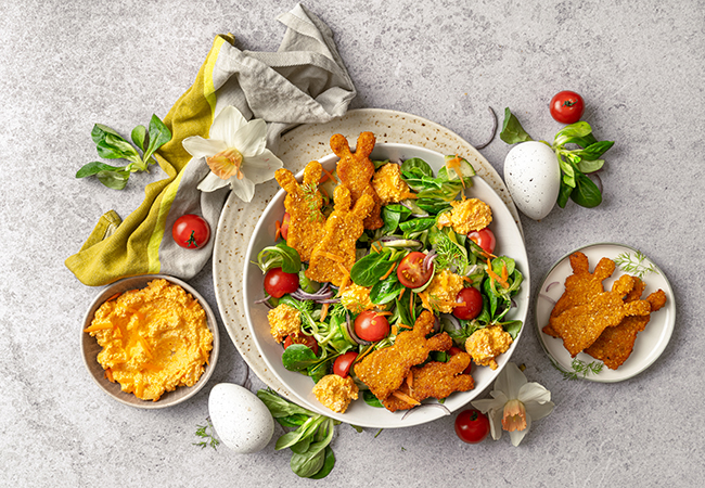 Reichlich Öl in einer Pfanne erhitzen und die Hasen von beiden Seiten goldbraun ausbacken. Salat mit Dip und Hasen anrichten. Zum Schluss noch etwas frischen Dill darüber geben.