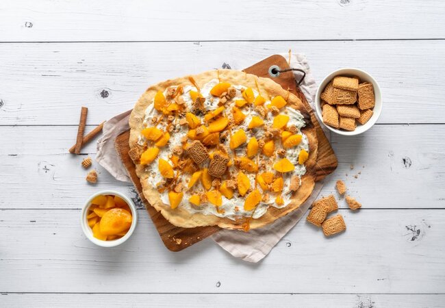 Flammkuchen mit Pfirsich und Spekulatius-Brösel