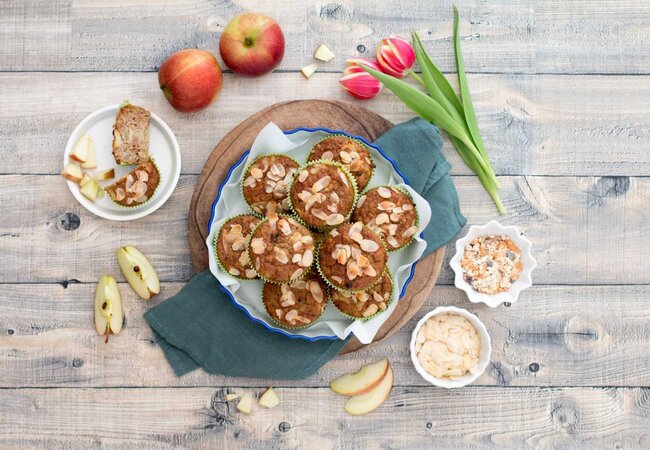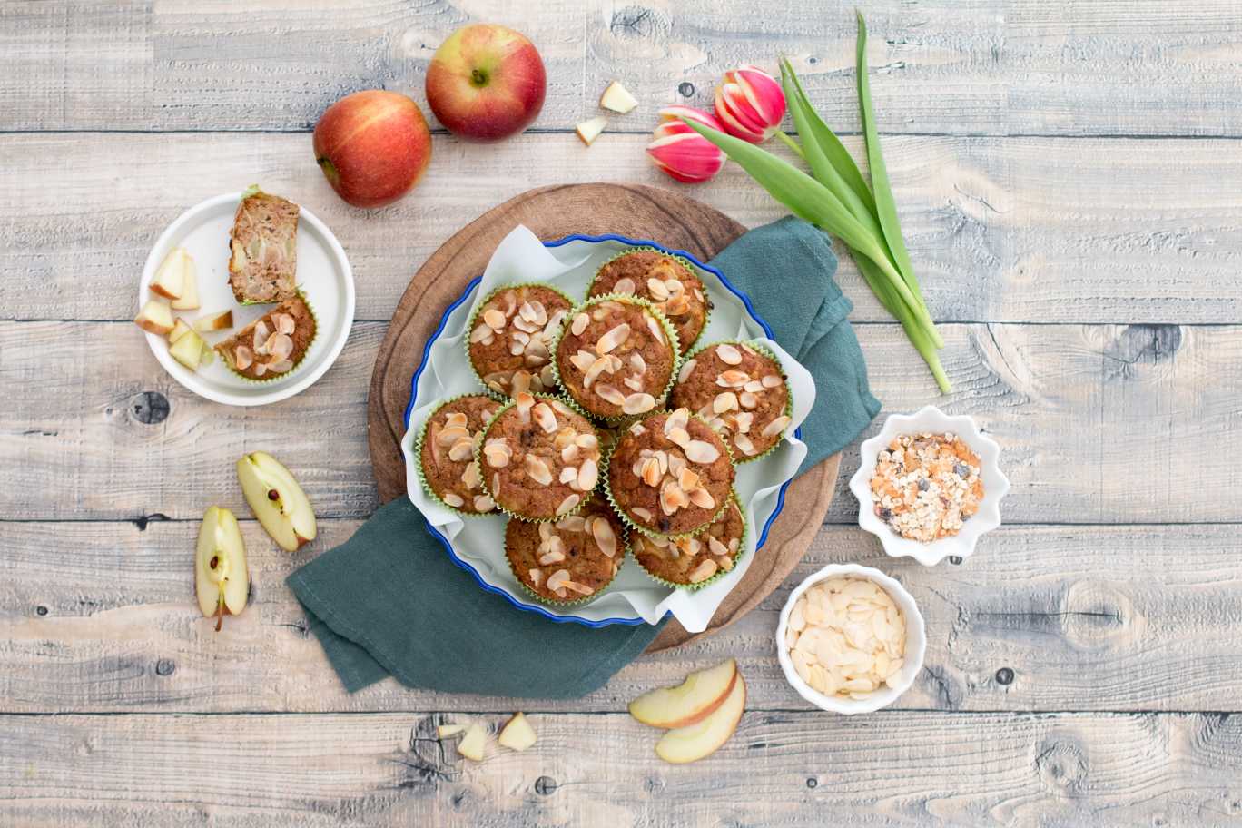 Äpfel waschen, entkernen und in kleine Würfel schneiden. Die Apfelwürfel und 30 g gehobelte Mandeln zum Teig geben und unterheben. Anschließend auf 12 Muffinförmchen verteilen, mit den restlichen Mandelblättchen bestreuen und im Ofen bei 180 Grad Ober-/Unterhitze 18-20 Minuten goldgelb backen.