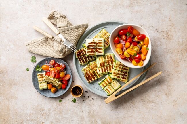 Gefüllte Zucchinitaschen vom Grill mit buntem Tomatensalat