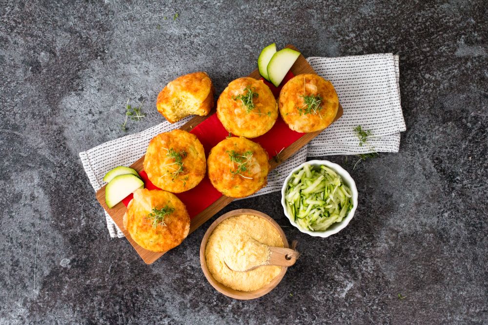" 120g Bauck Maismehl" , " 50g Bauck Maisstärke" , " 200g Zucchini" , " 2 Eier" , " 200 ml Milch" , " 100g Bergkäse, gerieben" , " 2 TL Backpulver" , " 1/2 TL Salz" , " Pfeffer"