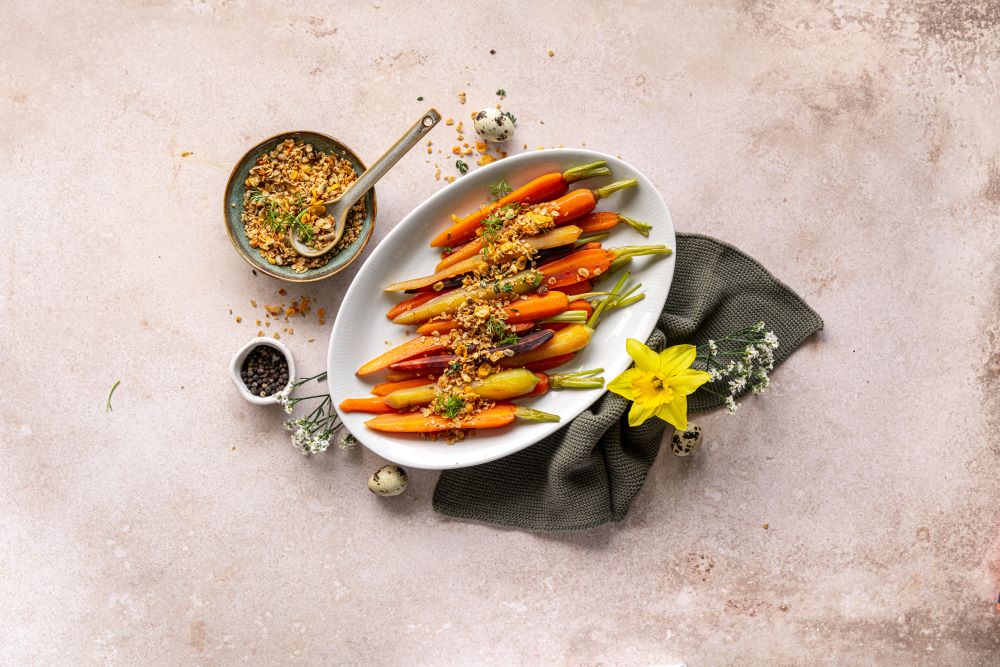 Glasiertes Wurzelgemüse mit Knuspertopping