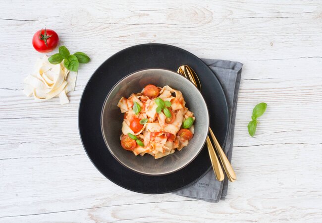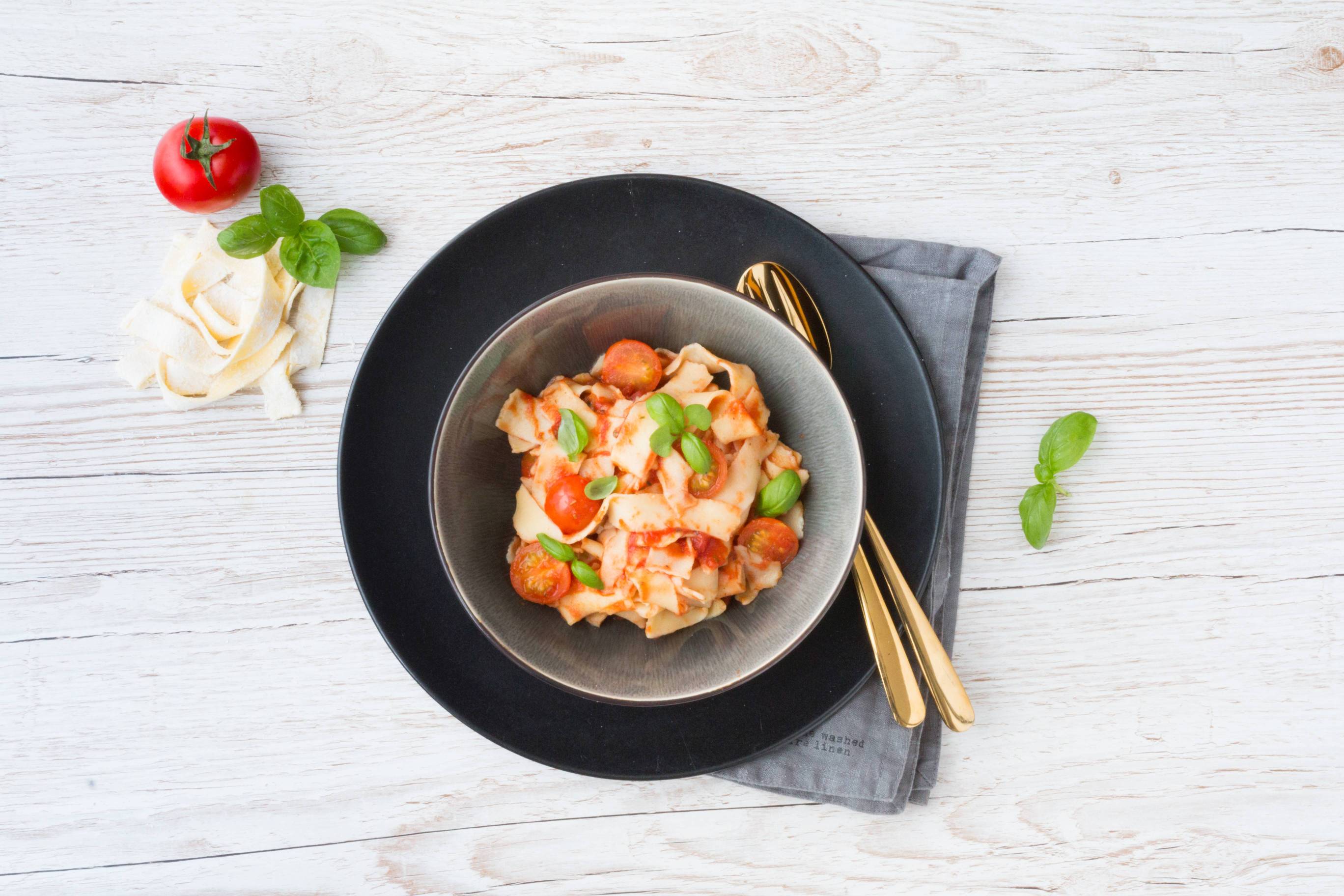 Ist der Teig zu feucht, zusätzlichen Mehl-Mix einarbeiten. Nudelteig nach Wunsch zuschneiden. In reichlich Salzwasser mit einem Schuss Öl ca. 5 Minuten kochen.