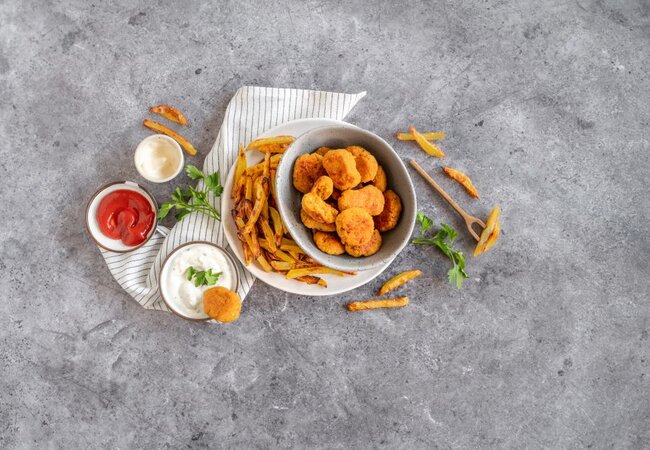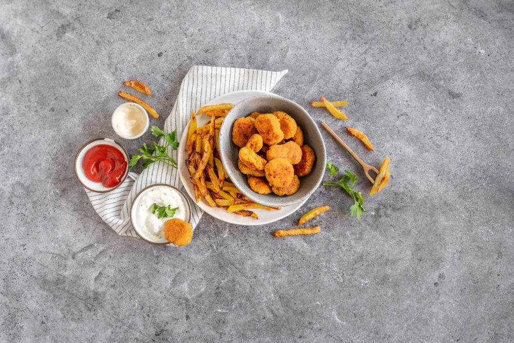" Bauck Gold Nuggets" , " 200 ml kaltes Wasser" , " Öl für die Pfanne" , "  Pommes 1,5 kg festkochende Kartoffeln" , " 5 EL Pflanzenöl" , " 3 EL  Bauck Reismehl" , " Etwas Salz" , " Ketchup 1 keine Schalotte" , " 1 kleine Knoblauchzehe" , " 200ml passierte Tomaten" , " ½ rote Paprika" , " 1 EL Sojasoße" , " 1/2 EL Essig" , " ½-1 EL brauner Zucker" , " Trüffelmayo 1 Eigelb" , " 50 ml Sonnenblumenöl" , " 1/2 TL Zitronensaft" , " 1 Prise Salz" , " 3 Tropfen Trüffelöl" , "  Kräuterdip 1 EL saure Sahne" , " 2 EL Créme fraîche" , " 1 EL gehackter Schnittlauch" , " 4-5 Blätter Basilikum" , " 1 Schuss Zitronensaft" , " Salz, Pfeffer"