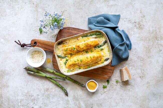 Tipp: Bei frischem Fisch den Spargel mit Soße etwa 10 Min. vorgaren. Erst dann den Fisch und das Topping hinzugeben.