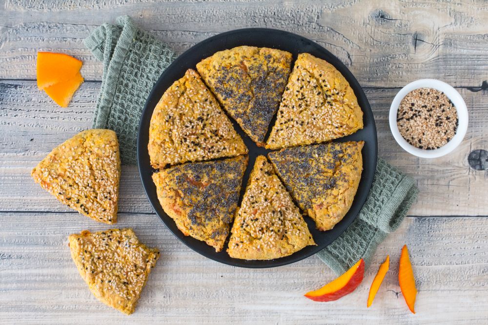 Die Hafermehl-Flocken-Mischung mit geriebenem Kürbis, Gouda, Frischkäse, Ei und weicher Butter vermengen und zu einem glatten Teig kneten.