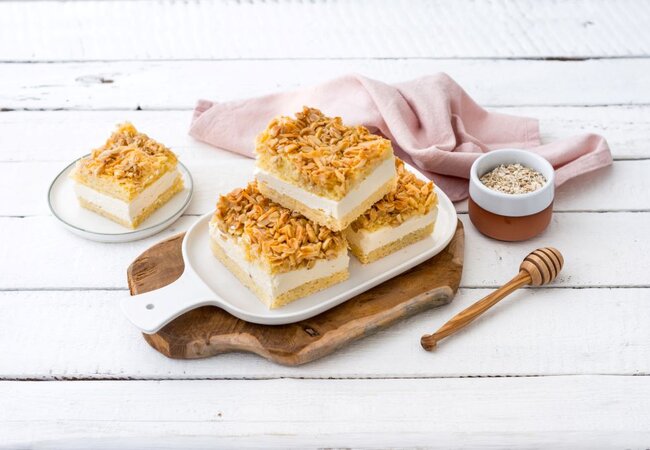 Zum Servieren den Bienenstich entlang der vorgeschnittenen Deckelstückchen anschneiden.