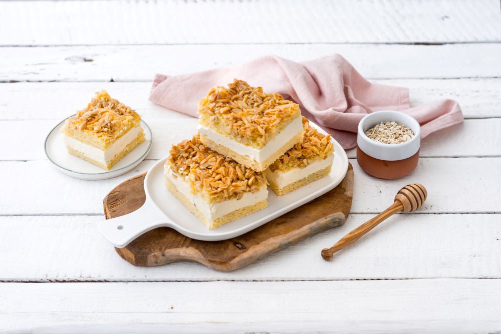 Für die Haferflocken-Mandel-Decke Butter, Zucker, Salz und Honig in einem Topf zum Kochen bringen. Die Mandeln und die Haferflocken unterrühren und die Masse vom Herd nehmen. Die Mischung gleichmäßig auf dem Teig verteilen. Den Teig bei 180° für 30-40min backen – danach komplett abkühlen lassen.
