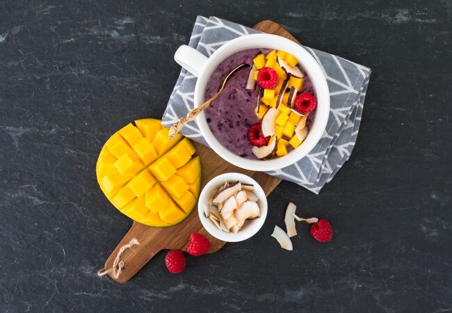 Mango vom Stein schneiden und die Schale entfernen. Das Fruchtfleisch in kleine Würfel schneiden, auf dem Brei verteilen und mit Himbeeren und gerösteten Kokoschips abrunden. Den Hirse-Buchweizenbrei lauwarm genießen.