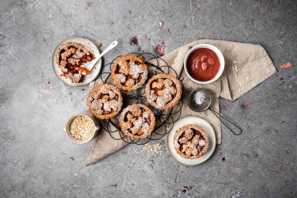Das Apfel-Rhabarbermus in den Förmchen verteilen. Den restlichen Teig zerrupfen und als Streusel über das Mus geben.