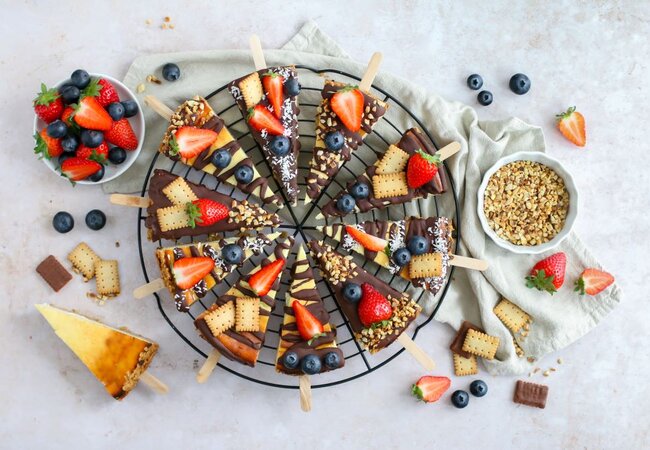 Die Kuchenstücke nun ganz oder teilweise mit der geschmolzenen Kuvertüre bedecken. Sofort mit gehackten Mandeln, Erdbeeren, Heidelbeeren und Mini-Butterkeksen dekorieren und erkalten lassen. Nun kann der Käsekuchen wie ein Eis am Stiel gegessen werden.