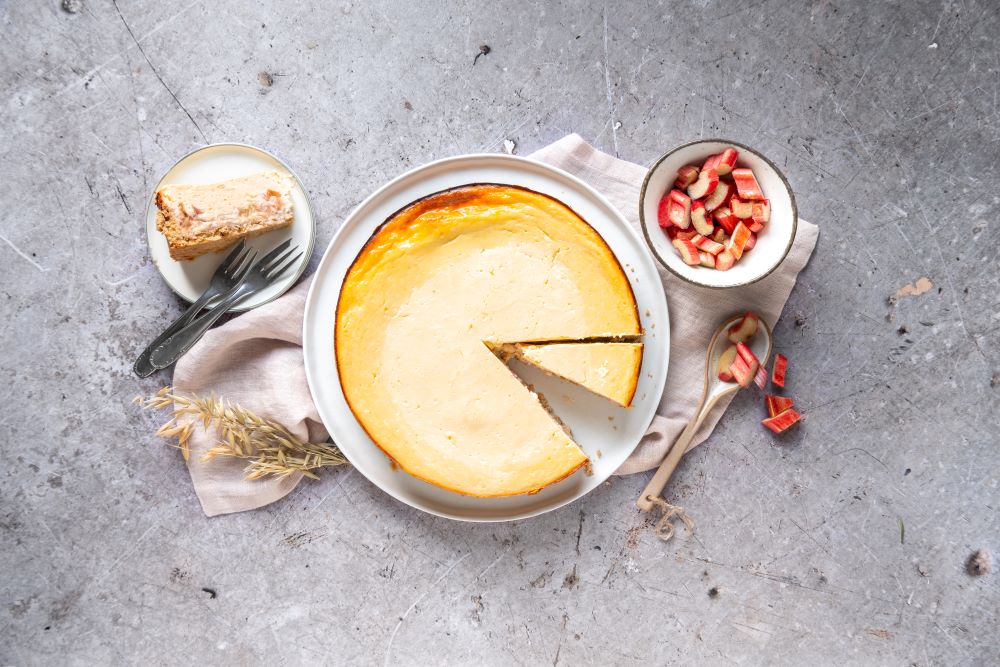 Rhabarber putzen, bei Bedarf schälen und in kleine Stücke schneiden. Die Rhabarberstücke auf den Käsekuchen-Boden gleichmäßig verteilen.