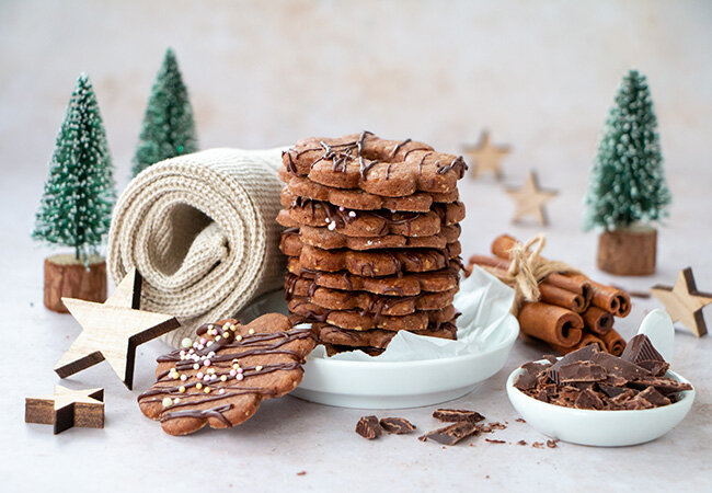 " 200 g Bauck Weizenmehl Type 405" , " 50 g gemahlene Nüsse" , " 1 TL Lebkuchengewürz" , " 1 Prise Salz" , " 100 g Zucker" , " 2 EL Backkakao" , " ½ TL Backpulver" , " 140 g weiche Butter" , " 1 Ei" , " 150 g Zartbitterkuvertüre" , " Optional gehackte Mandeln oder Streusel  "