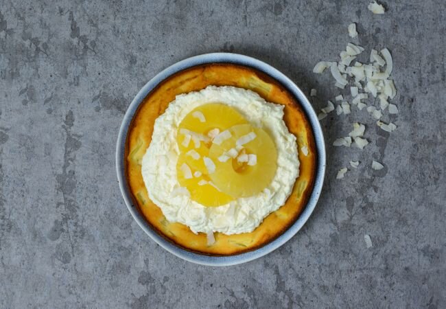 Für die Creme die Sahne steif schlagen. Dann den Joghurt und die Kokosraspel vorsichtig unterheben.