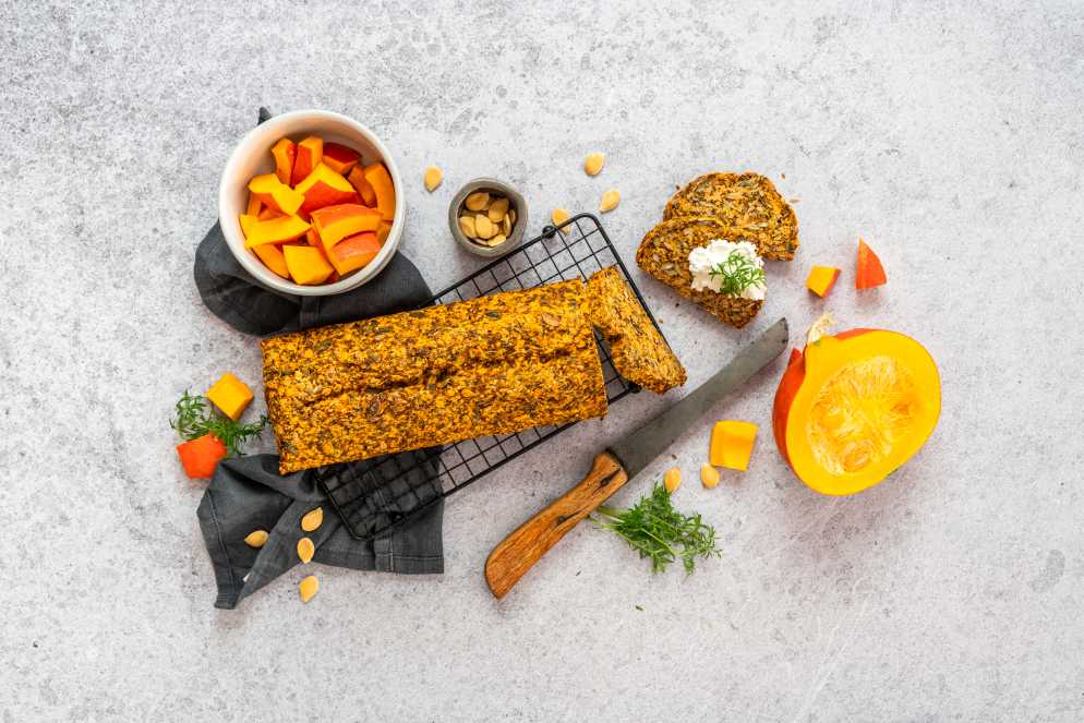 Den Ofen auf 200°C vorheizen und das Brot für 70min backen. Danach komplett auskühlen lassen und aus der Form lösen.