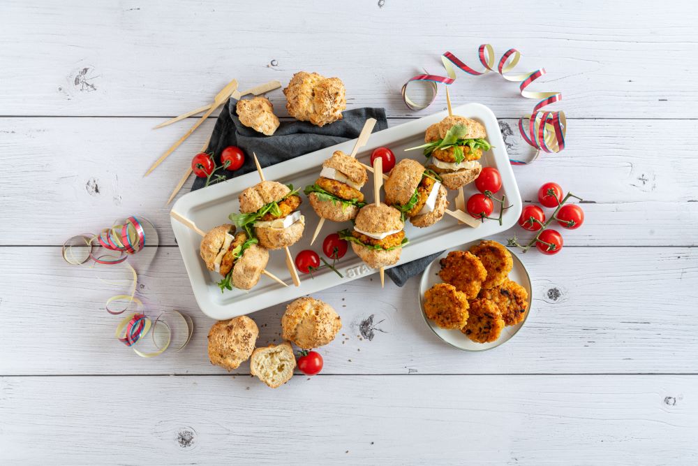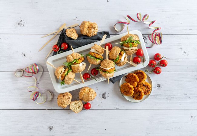 Die Burgermasse zu 12 kleinen Patties formen und in reichlich Öl von beiden Seiten anbraten. Die Brötchen halbieren und mit den Zwiebeln bestreichen. Alles mit Rucola, den Tomatenburgern und einem kleinen Stück Blauschimmelkäse belegen und die Burger mit kleinen Holzspießen fixieren.