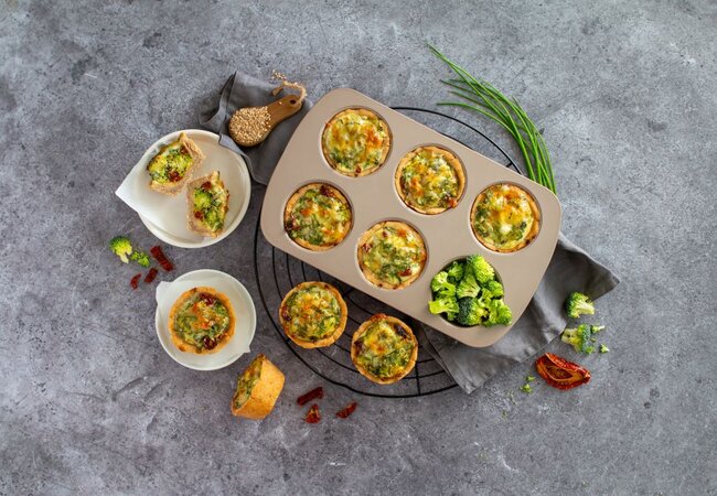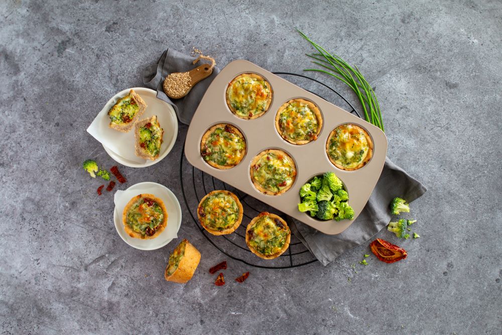 Den Teig in die Vertiefungen des Muffinblechs geben und mit den Händen zu einem gleichmäßigen Boden und Rand festdrücken. Im Ofen ca. 10 Minuten vorbacken, dann aus dem Ofen nehmen.