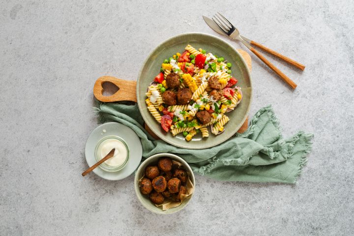 Einen großen Topf mit Salzwasser zum Kochen bringen, den Maiskolben, die TK Erbsen und die Fusilli Nudeln zugeben. Nach Packungsanleitung bissfest garen, dann alles zusammen abgießen und kalt abschrecken.