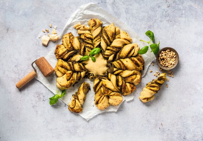 Den Ofen auf 200°C Ober-/Unterhitze vorheizen und die Pestoblume für 20-25min backen.