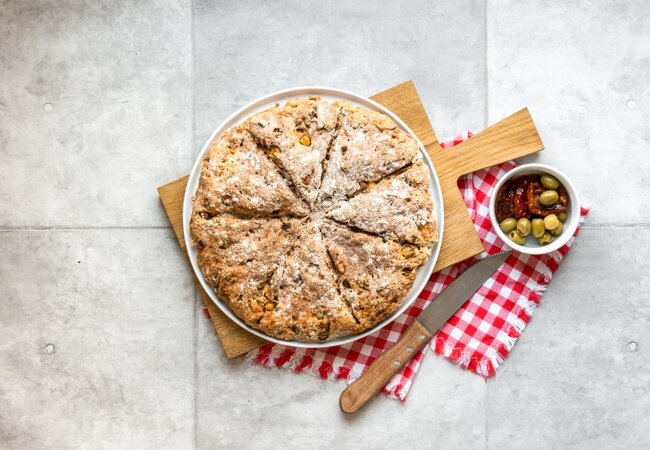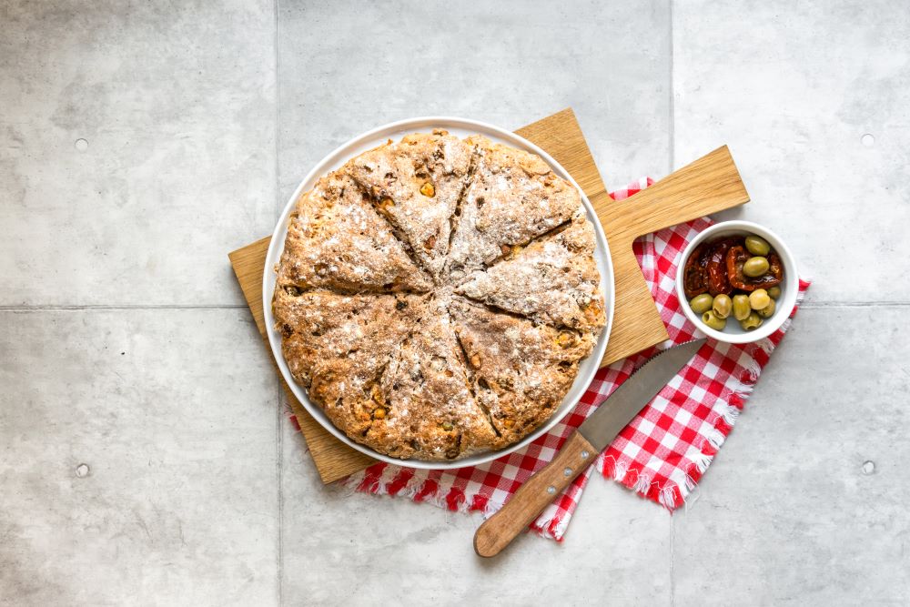 Das Brot nach Packungsanleitung zubereiten. Tomaten, Oliven und Feta in kleine Stücke schneiden und in den Teig einarbeiten.
