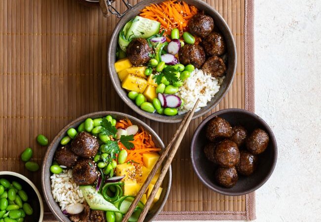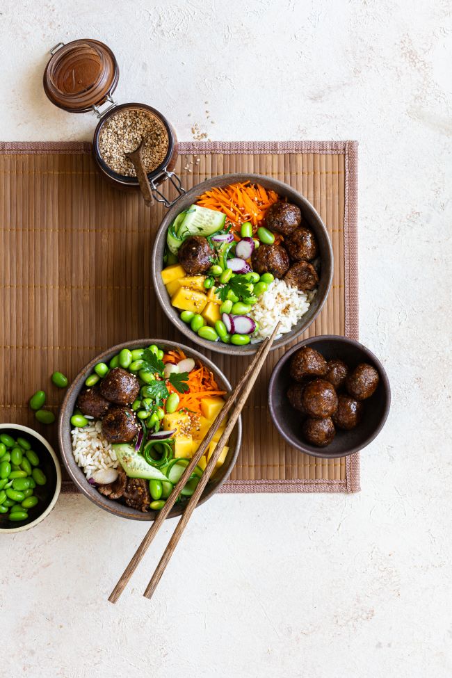 Poke Bowl mit glasierten Köttbullar
