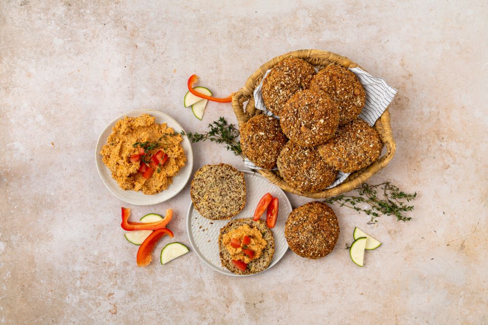 " 1 gelbe Paprika" , " 1/2 Zucchini" , " 1/2 Zwiebel" , " 2 Knoblauchzehen" , " 2 EL Olivenöl" , " 2 EL Bauckhof GF Semmelbrösel Mais" , " 200g Hüttenkäse" , " 1/2 TL italienische Kräuter" , " 1 TL Tomatenmark" , " 1 TL Paprikapulver" , " Salz, Pfeffer"