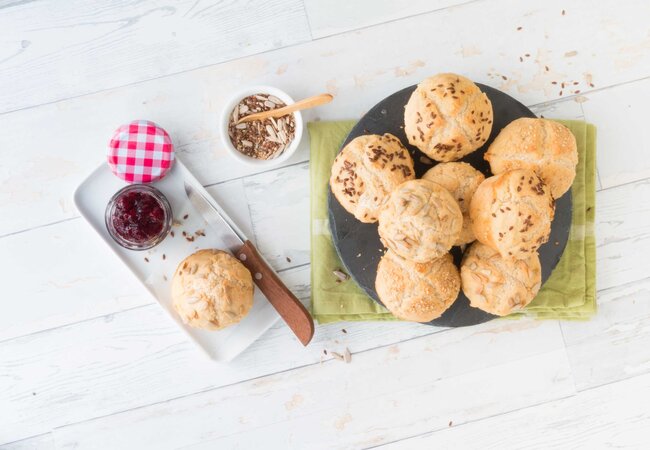 Ersetzen Sie ¼ des Wassers mit einem Becher Crème fraîche, damit die Brötchen noch saftiger werden.