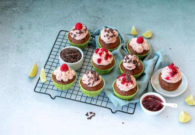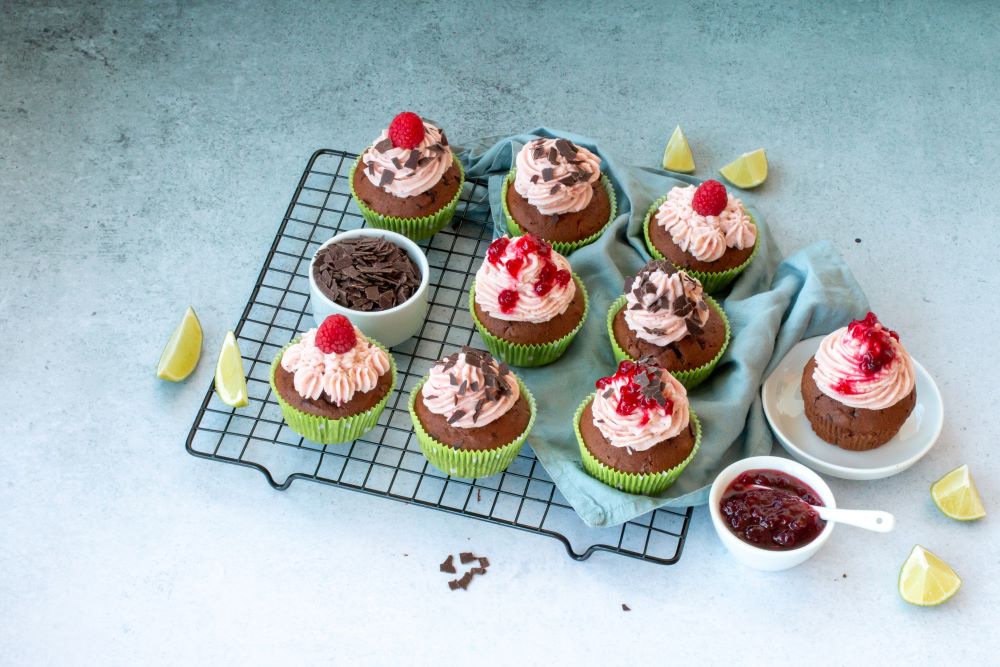 Das Preiselbeerfrosting in einen Spritzbeutel füllen und auf die ausgekühlten Schoko-Muffins aufspritzen. Mit Raspelschokolade und optional einem kleinen Klecks Preiselbeer-Konfitüre garnieren. Bis zum Servieren kaltstellen.