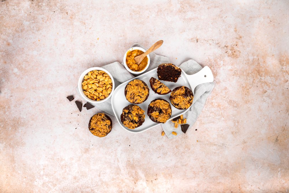 Die restliche Erdnussbutter auf den Teig geben und mit einer Gabel leicht vermischen. Die Muffins für etwa 25 Minuten backen.