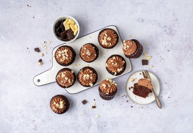 In der Zwischenzeit die Creme nach Packungsanleitung zubereiten und in einen Spritzbeutel mit Sterntülle füllen. Die abgekühlten Muffins mit der Creme verzieren.
