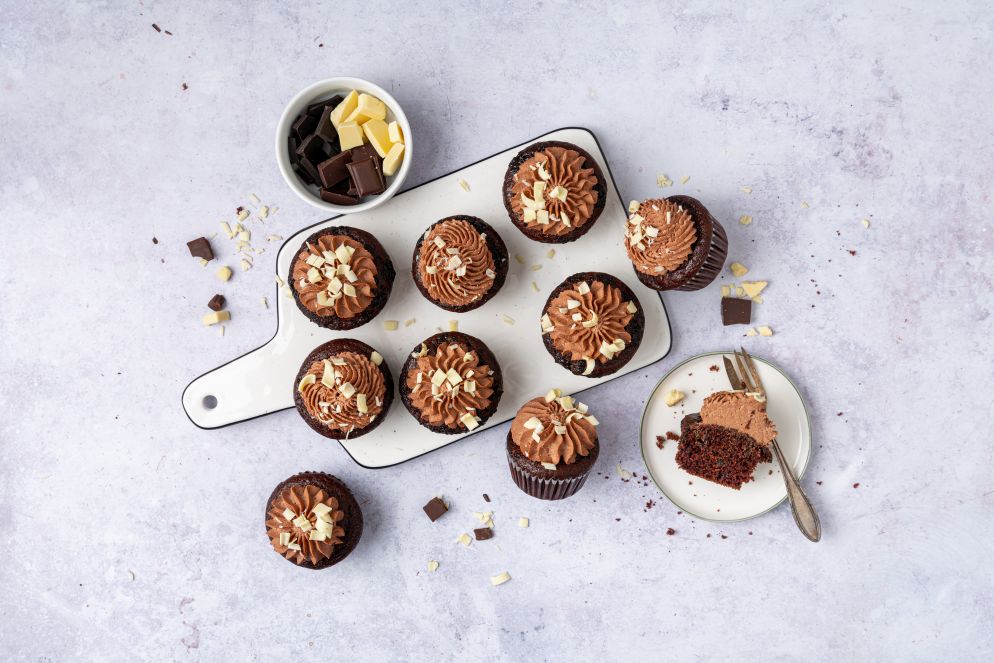 Zuerst den Schokoladenteig nach Packungsanleitung zubereiten, die Wassermenge dabei um 30ml reduzieren und durch 30ml Espresso ersetzen. Die dunkle Schokolade hacken und unterheben