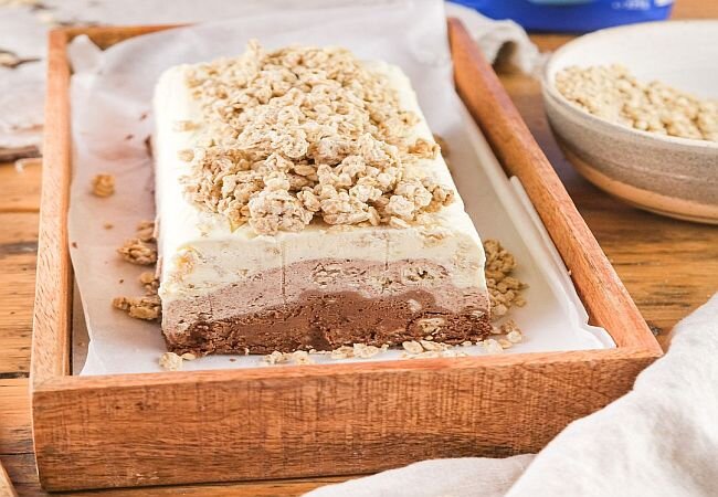 5 Minuten vor dem Genießen aus dem Tiefkühler nehmen und ein wenig antauen lassen. Mit Knuspermüsli dekorieren, schneiden und servieren.